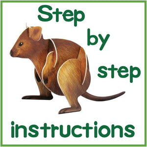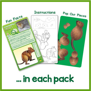 Just pop out the pieces and make your very own quokka. It's easy and fun to make it yourself and then perhaps take a selfie with it (like so many tourists do with real live quokkas). Included in the pack are instructions and some fun facts about these happy little marsupials. See an example below.